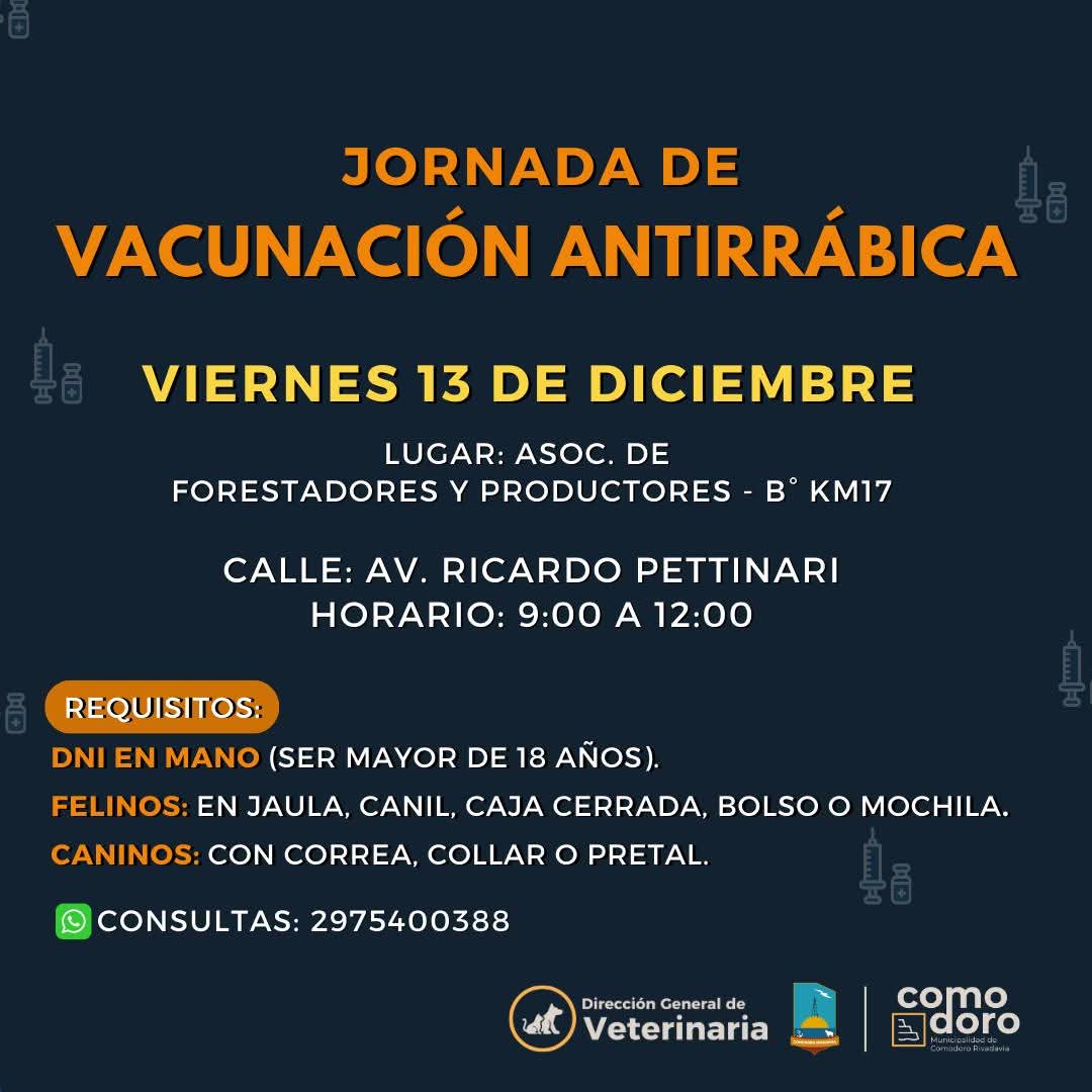 Desde la Dirección de Veterinaria de la Municipalidad de Comodoro Rivadavia informaron que este viernes 13 de diciembre habrá una jornada especial de vacunación antirrábica.
