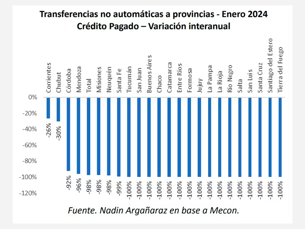 El Instituto Argentino de Análisis Fiscal (Iaraf) midió, por su parte, que respecto a las transferencias no automáticas “en enero las provincias recibieron $13.322 millones (crédito pagado), lo que implica una caída interanual nominal de 91% y una caída real de 98 por ciento. Si se considera el gasto devengado se observó una suba nominal del 36% y una caída real del 62 por ciento. Todas las jurisdicciones tuvieron una caída interanual real en el gasto pagado. Las menores caídas se observaron en Corrientes (-26%), Chubut (-30%) y Córdoba (-92 por ciento). Respecto al gasto devengado, 4 jurisdicciones tuvieron una suba interanual real. Santiago del Estero (44%), Catamarca (37%), Misiones (19%) y La Rioja (4%)”, concluyó.