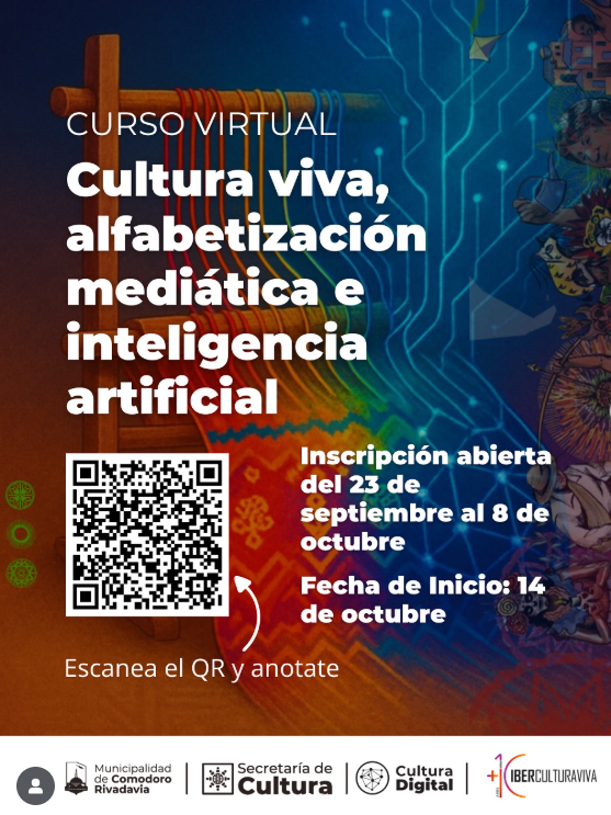 Se trata del curso virtual y gratuito “Cultura viva, alfabetización mediática e inteligencia artificial”, una iniciativa impulsada por IberCultura Viva junto a la Secretaría de Cultura de Comodoro Rivadavia, a través del Programa de Cultura Digital y Alfabetización Mediática.