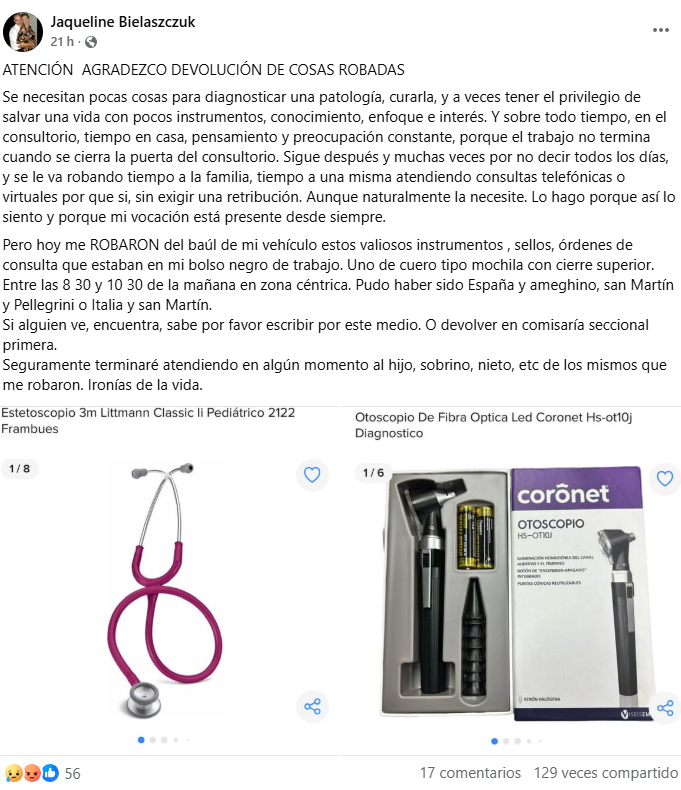 Con indignación y tristeza, la profesional apeló a la empatía de la comunidad: «Seguramente terminaré atendiendo en algún momento al hijo, sobrino o nieto de los mismos que me robaron. Ironías de la vida», lamentó.