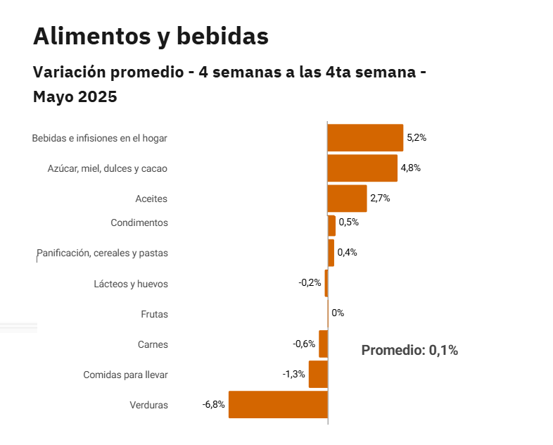 En lo que respecta a la variación por rubros, el informe muestra una baja considerable del precio de las verduras (-6,8%). También cayó el valor de las comidas listas para llevar (-1,3%), de las carnes (-0,6%), las frutas (-0,4%) y los “productos lácteos y huevos” (-0,2%). Otros productos sí subieron, como fue el caso de las bebidas e infusiones, que presentaron un incremento del 5,2% en mayo.