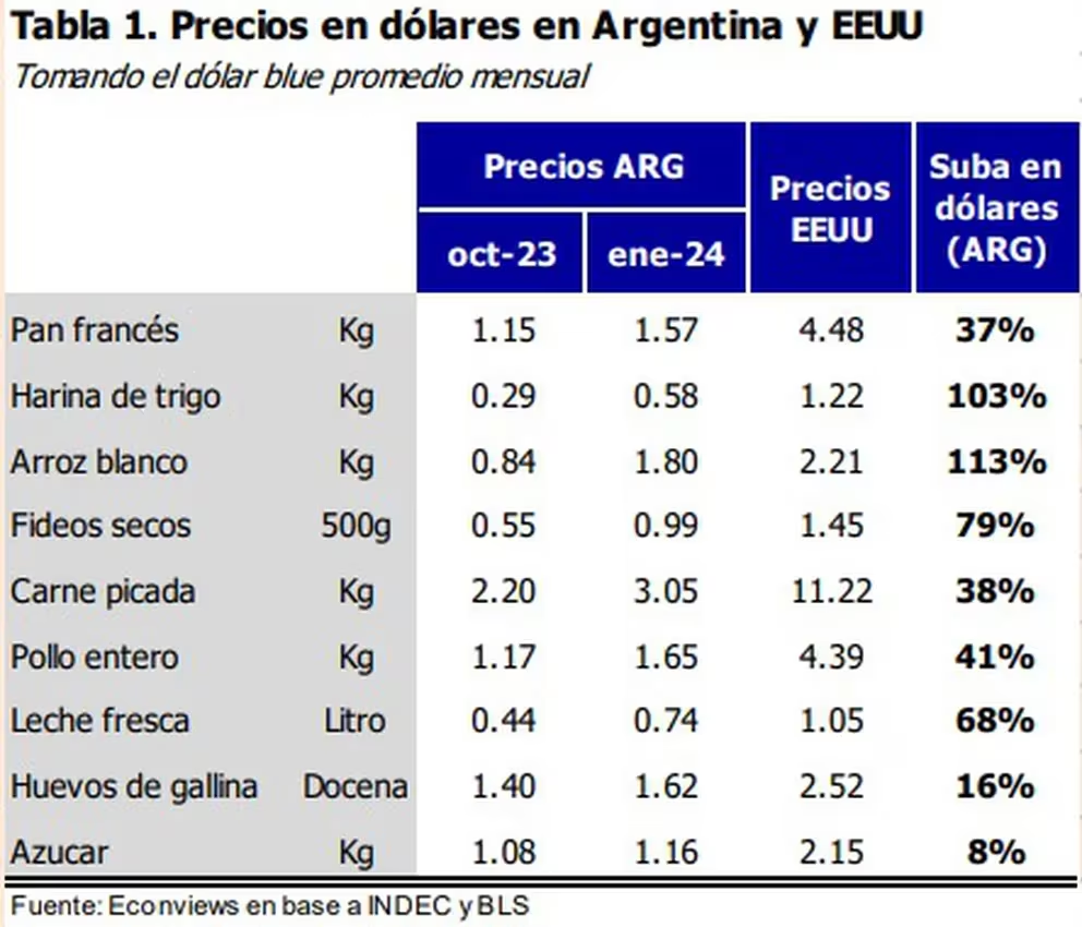 El trabajo afirma que el país no está “caro en dólares” cuando se toma la canasta de alimentos que publica el Indec y se la compara con la de Estados Unidos. “Tomada al blue, en enero la canasta de supermercado que publica el INDEC salía la mitad que en EEUU. Pero en octubre era un tercio. En tres meses, algunos productos se encarecieron un 40-100% medidos a ese tipo de cambio”, advirtieron.