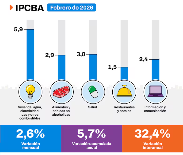 Con el dato de febrero, la inflación acumulada en el primer bimestre del año llega al 5,7%, mientras que el alza interanual del costo de vida en la Capital es del 32,4%. El jueves de esta semana se conocerá el dato nacional del Indec, que según estimaciones de consultoras privadas estará entre 2,6% y 2,9%.