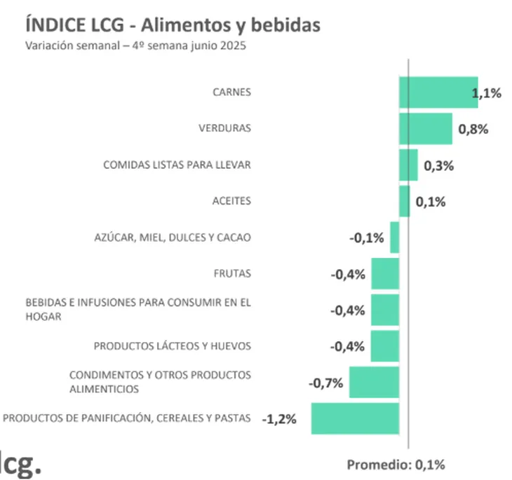 En la medición de LCG, el aumento de alimentos fue de 0,1% promedio en la semana. «Carnes y Verduras explicaron la inflación semanal, compensado parcialmente por la caída en otros rubros relevantes como Panificados y Lácteos», destacaron desde la consultora.