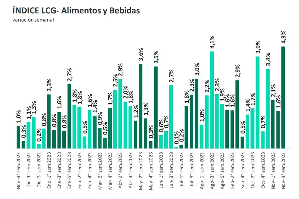 La consultora PxQ por su parte indicó que «al finalizar la jornada del viernes, en el sector de Alimentos y Bebidas, que representa la división más relevante en el IPC, la variación acumulada desde el inicio del mes es del 10,6%. En lo que respecta a los acontecimientos de la semana, la variación acumulada en esta categoría entre el lunes y el viernes ascendió a un 4,9%, destacándose los días miércoles, jueves y viernes con incrementos del 0,9%, 2,5% y 0,8%, respectivamente”, analizaron.