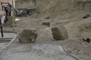 A las 3:30 de la madrugada de hoy, el Servicio Meteorológico Nacional determinó la finalización del alerta previsto para este fin de semana. Una gran masa de greda se desprendió del Chenque (foto) cayendo en inmediaciones de la esquina de Huergo y Francia.