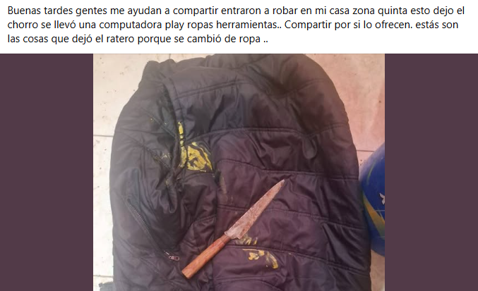 Lo particular del caso es que el ladrón dejó en el lugar varias prendas de ropa. La vecina pidió a la comunidad que estén atentos y compartan esta información por si alguien intenta vender o ofrecer estos objetos.