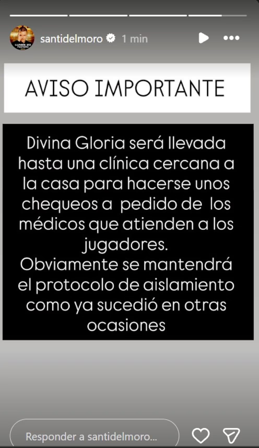 Hace tan solo unos minutos, Santiago del Moro, conductor del reality más famoso del país, anunció a través de sus redes sociales que Divina Gloria deberá abandonar la casa por unas horas. El comunicado oficial informó: “AVISO IMPORTANTE. Divina Gloria será llevada hasta una clínica cercana a la casa para hacerse unos chequeos a pedido de los médicos que atienden a los jugadores. Obviamente se mantendrá el protocolo de aislamiento como ya sucedió en otras ocasiones”.