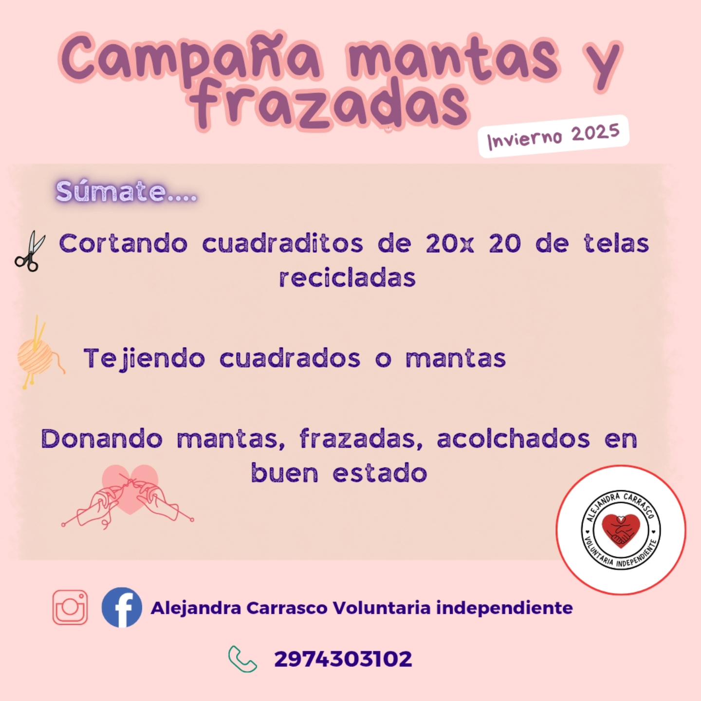 Ante la llegada de las bajas temperaturas, la voluntaria independiente Alejandra Carrasco lanzó una campaña solidaria para recolectar mantas, frazadas y acolchados destinados a quienes más lo necesitan.