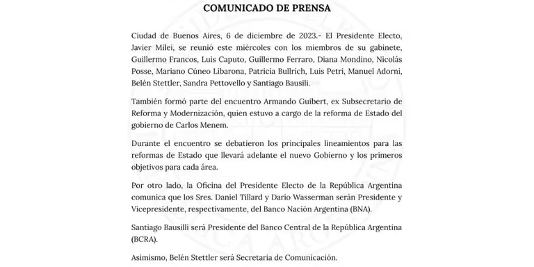 “La Oficina del presidente electo de la República Argentina comunica que los Sres. Daniel Tillard y Darío Wasserman serán presidente y vicepresidente, respectivamente, del Banco Nación Argentina (BNA)”, dice el escrito.