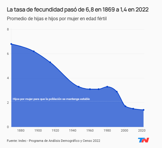Según los datos del último Censo, el promedio de hijas e hijos nacidos vivos por mujer en edad fértil pasó de 1,7 a 1,4 entre 2001 y 2022. La perspectiva histórica es elocuente: el censo de 1869 calculó un promedio de 6,8 hijos por mujer.