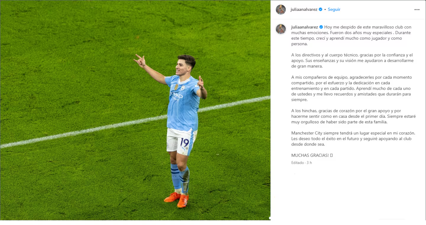Además, Julián se acordó de sus compañeros e hinchas del City: “A mis compañeros de equipo, agradecerles por cada momento compartido, por el esfuerzo y la dedicación en cada entrenamiento y en cada partido. Aprendí mucho de cada uno de ustedes y me llevo recuerdos y amistades que durarán para siempre. A los hinchas, gracias de corazón por el gran apoyo y por hacerme sentir como en casa desde el primer día. Siempre estaré muy orgulloso de haber sido parte de esta familia”.