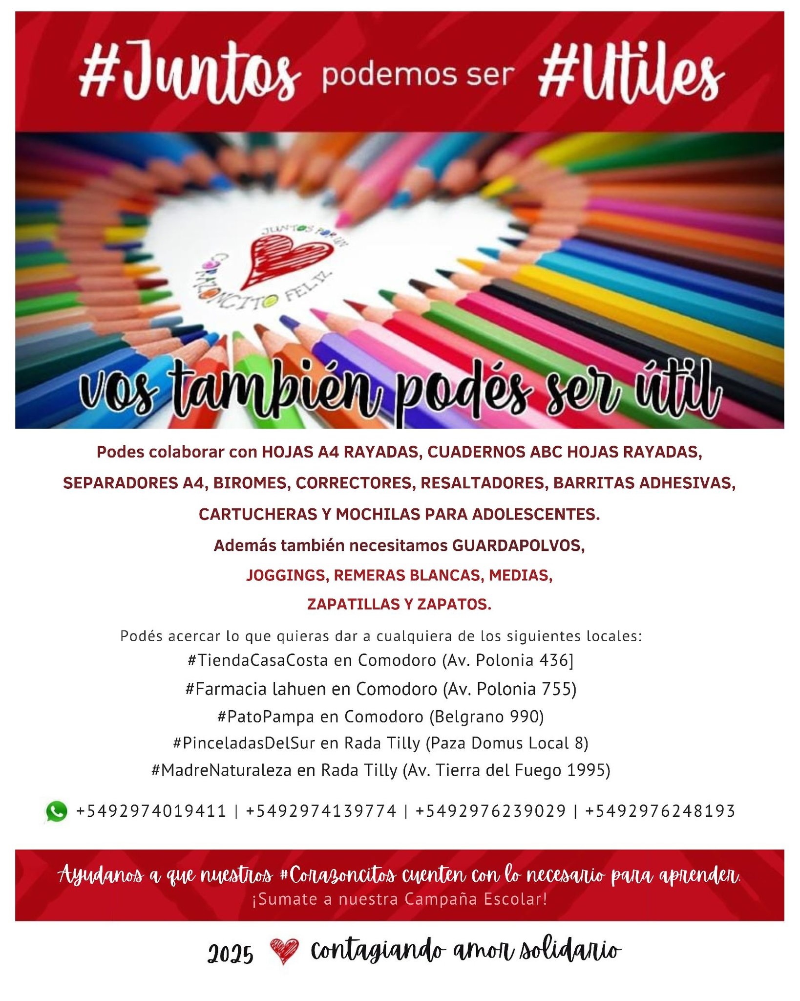 «Tu aporte puede marcar la diferencia», indicaron desde Juntos Por Un Corazoncito Feliz. Con las donaciones, los chicos y adolescentes podrán comenzar las clases con los materiales que necesitan.