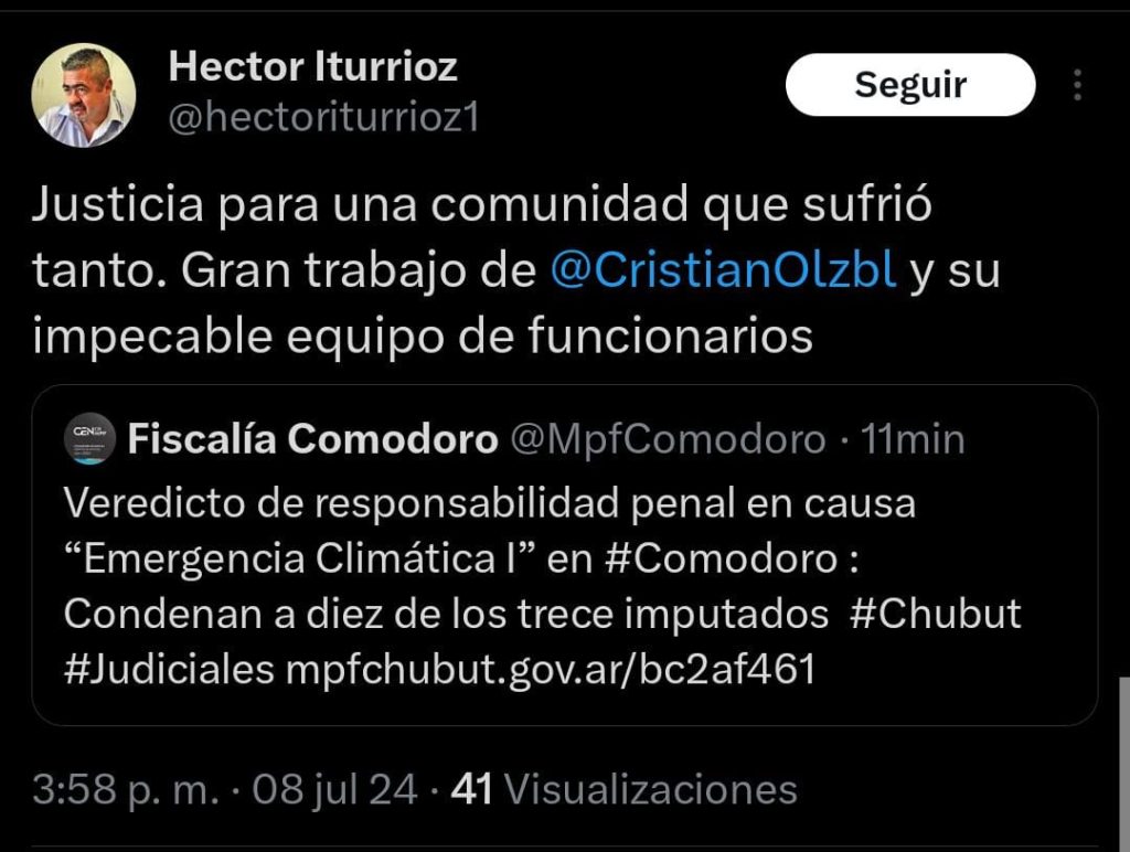 En ese marco, a través de su cuenta de X, el ministro de Seguridad de Chubut Héctor Iturrioz celebró el resultado y agradeció el accionar de la Justicia y del fiscal Cristian Olazabal.