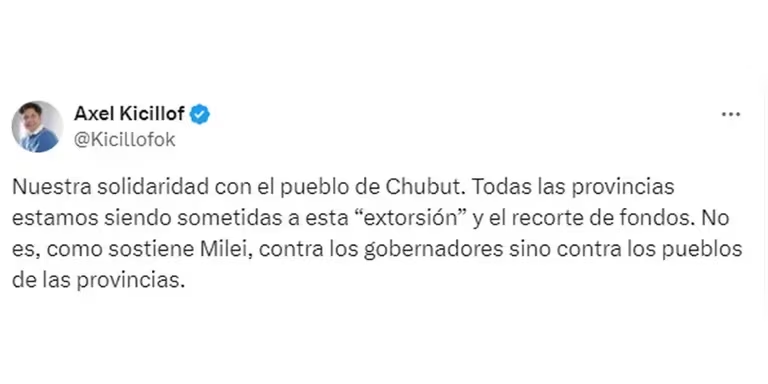 A través de su cuenta de X, el economista demostró su apoyo a Ignacio Torres tras el cruce con el Gobierno nacional. Además, corrigió las declaraciones del presidente: “Nuestra solidaridad con el pueblo de Chubut. Todas las provincias estamos siendo sometidas a esta ‘extorsión’ y el recorte de fondos. No es, como sostiene Milei, contra los gobernadores, sino contra los pueblos de las provincias”.