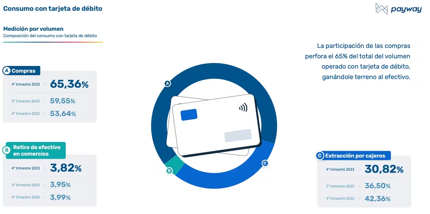 Dentro de las operaciones con tarjeta débito, Payway distingue tres alternativas: compras, retiro de efectivo en cajeros y extracción de dinero en comercios. Allí se vio el crecimiento de las compras, que representaron el 65,4% del volumen total en el último trimestre del año pasado, esto es, casi seis puntos por encima de lo registrado tres meses antes.