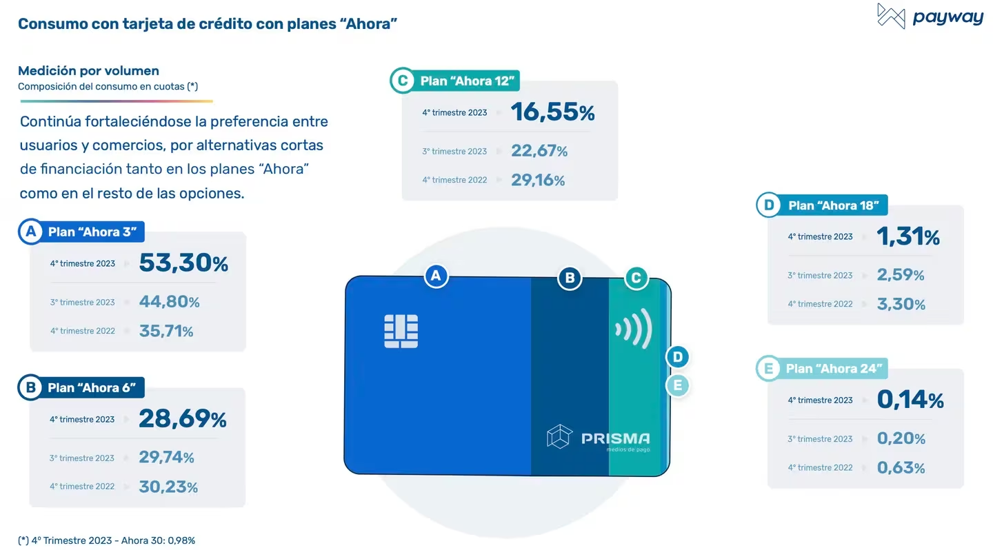 En línea con el nuevo plan del Gobierno, los datos de Payway ratifican la preferencia de los consumidores por los planes de cuotas más cortos. Un 58,6% del volumen total pagado con tarjetas de crédito se hizo en un pago durante el último trimestre, mientras que el resto se dividió casi en partes iguales entre los planes “Ahora” y las financiaciones bancarias. En ambos casos, los esquemas de hasta tres pagos representaron más de la mitad del volumen.
