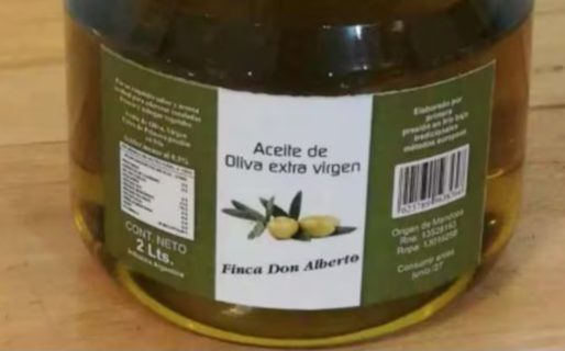 En cuanto al aceite de oliva, rotulado como “Aceite de Oliva Extra Virgen, marca Finca Don Alberto”, el análisis reveló que el RNE y RNPA mencionados eran inexistentes, lo que también llevó a su clasificación como “producto ilegal”.