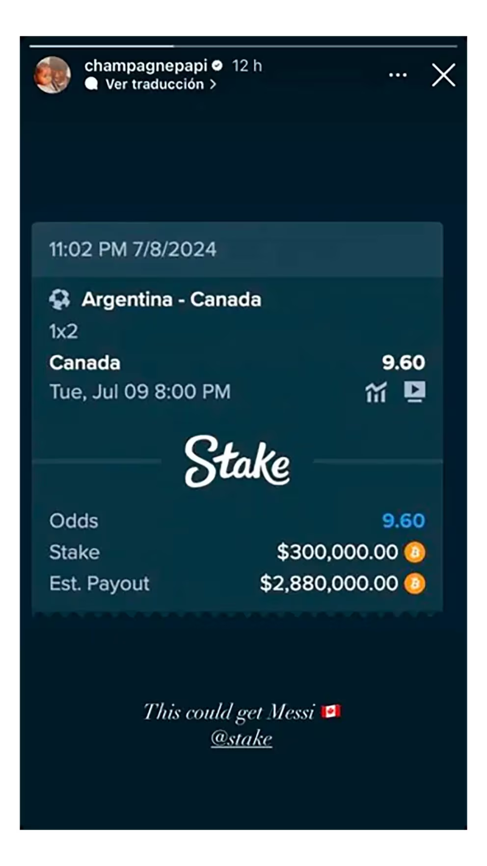 En sus redes sociales, Drake, quien en más de una oportunidad expresó su admiración por la Pulga, publicó en sus redes el recibo de su apuesta, acompañado de la frase “Esto podría ponerse feo, Messi”. Si el golpe deportivo que auguraba el músico se concretaba, hubiera podido ganar 2.880.000 dólares. Pero no sucedió. Y terminó siendo blanco de las burlas y los memes en las redes.