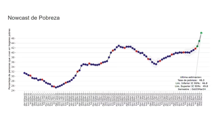 Según el Nowcast de Pobreza que calcula el investigador de la Universidad Torcuato Di Tella, Martín González Rozada, la tasa de pobreza fue del 48,3% para el semestre octubre-marzo. “La incidencia proyectada es un promedio ponderado de una tasa de pobreza estimada en 44.9% para el cuarto trimestre de 2023 y 51,8% para el primer trimestre de 2024″, consignó el informe de la casa de estudios.