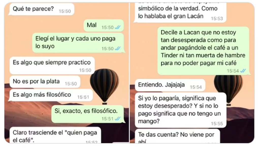 “Decile a Lacan que no estoy tan desesperada como para andar pagándole el café a un Tinder ni tan muerta de hambre para no poder pagar mi café”, continuó ella.