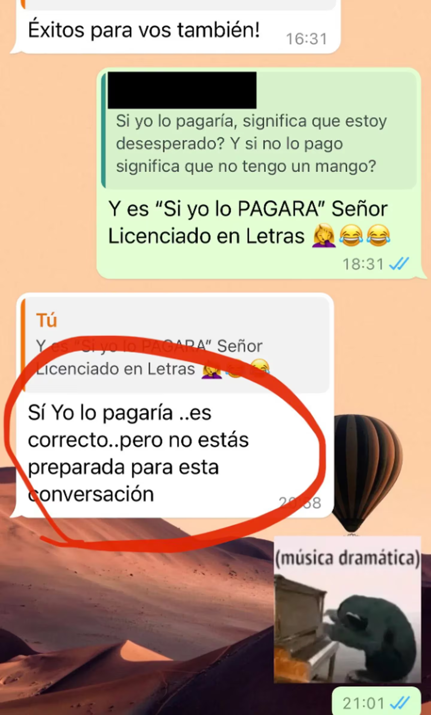 Él expresó: “Entiendo. Si yo lo pagaría (sic), ¿significa que estoy desesperado? ¿Y si no lo pago significa que no tengo un mango? ¿Te das cuenta? No viene por ahí”. N. le dijo: “Éxitos con tu filosofía”. Un par de horas más tarde, ella volvió a la charla para remarcarla lo siguiente: “Y es ‘si yo lo pagara’, señor licenciado en Letras”. Él completó: “‘Si yo lo pagaría’ es correcto. Pero no estás preparada para esta conversación”.
