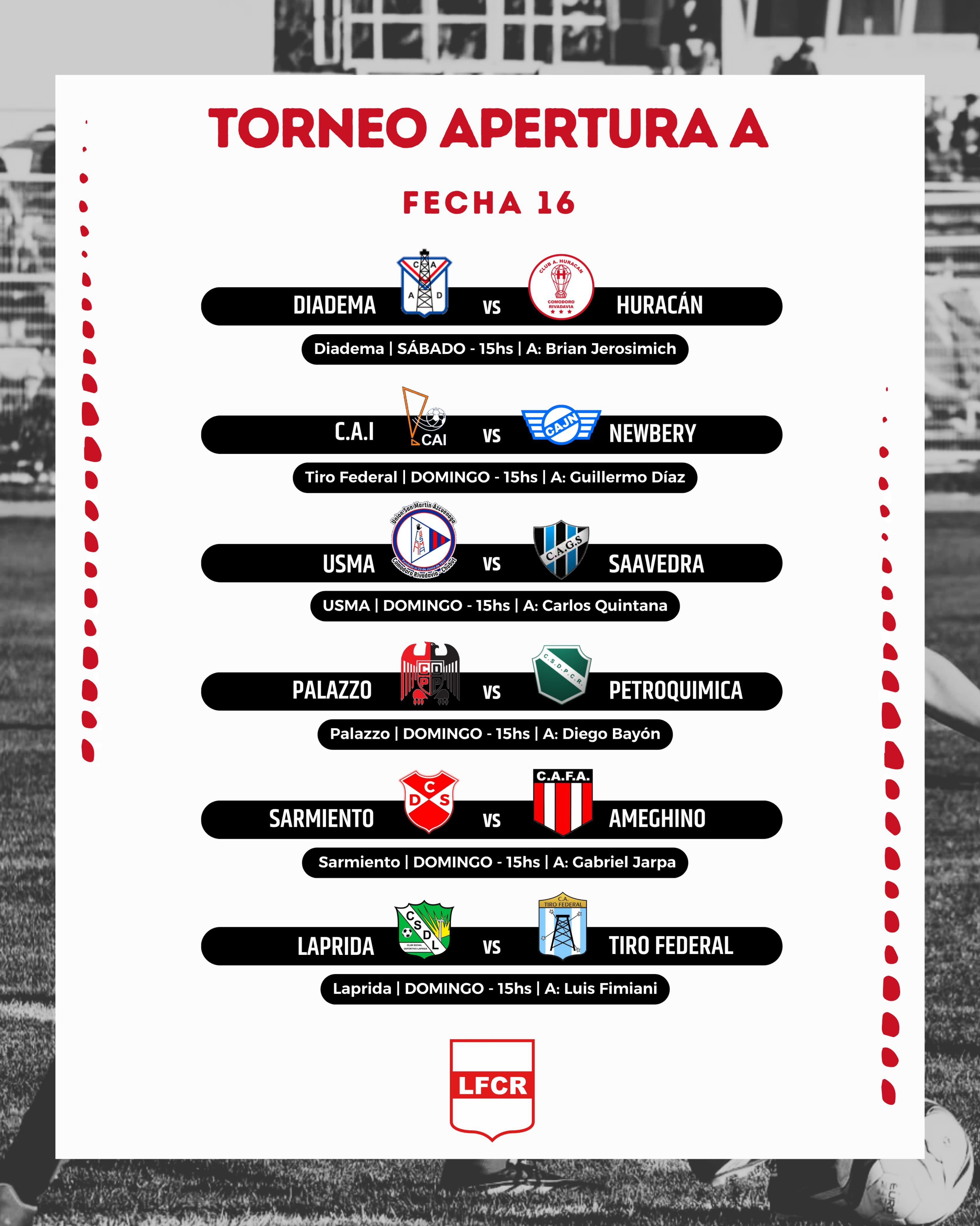 Este sábado se pone en marcha la fecha 16 del Torneo Apertura A con el duelo entre Diadema y Huracán a las 15 horas en Km27.