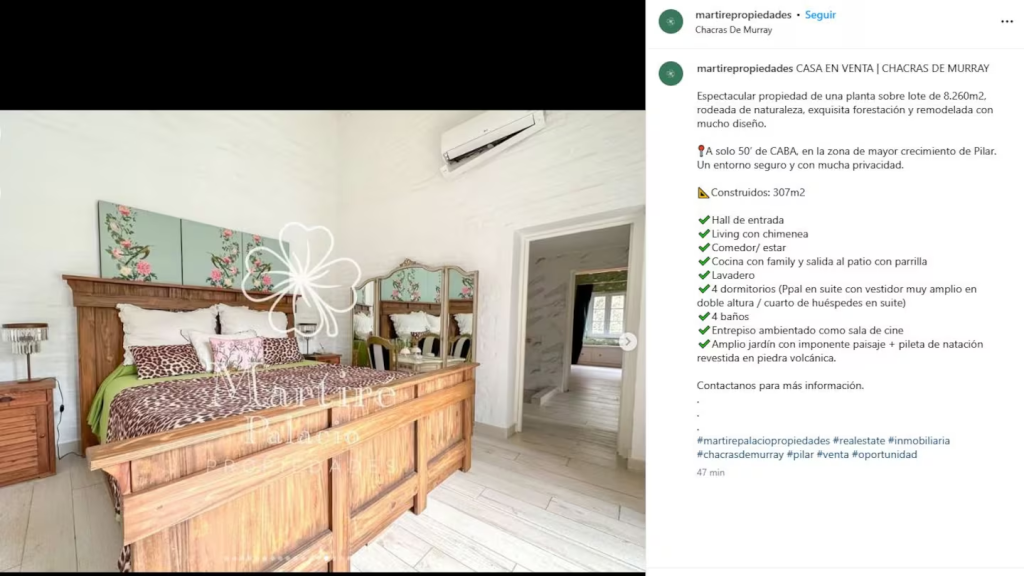 En el posteo, recalcaron que la propiedad está a solo 50 minutos de la Ciudad de Buenos Aires en una zona muy buscada de la localidad de Pilar. También describió que tiene: 307 metros cuadrados construidos, hall de entrada, living con chimenea, comedor, sala de esta, cocina con family y salida al patio con parrilla.