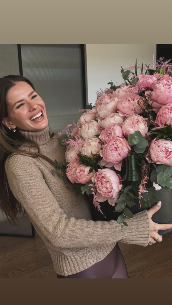 En otras de las fotos que compartió, a la actriz se la ve sonriendo mientras sostiene el arreglo de peonías, una flor muy utilizada en ramos elegantes.