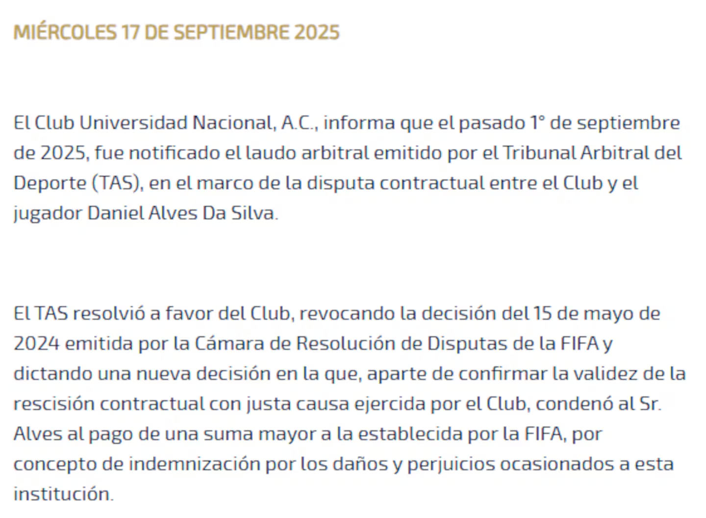 Después de una larga disputa legal, el Tribunal de Arbitraje Deportivo (TAS) falló a favor del Club Universidad Nacional (Pumas) y determinó que el exjugador brasileño Dani Alves deberá pagar una indemnización de 5 millones de dólares por incumplimiento de contrato.