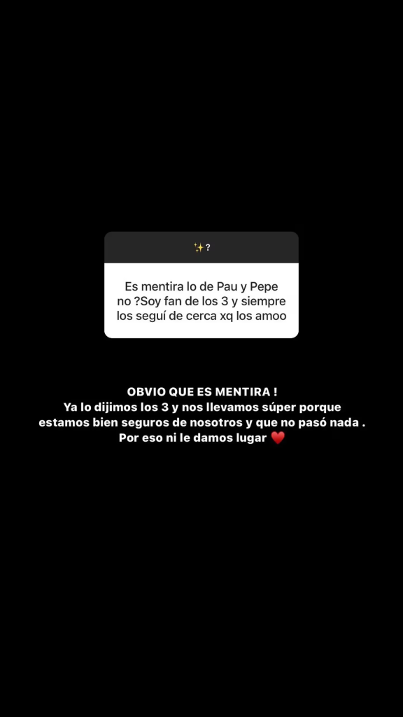 “Es mentira lo de Pau y Pepe, ¿no? Soy fan de los tres y siempre los seguí de cerca porque los amo”, le consultó un seguidor muy preocupado. “¡Obvio que es mentira!”, respondió la bailarina sin vueltas.