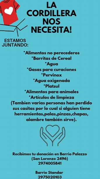 Bajo el lema “La cordillera nos necesita”, la institución informó que se encuentran recolectando donaciones destinadas tanto a familias damnificadas como a animales que resultaron afectados por el fuego. Entre los elementos solicitados se encuentran alimentos no perecederos, barritas de cereal, agua, gasas para curaciones, pervinox, agua oxigenada, Platsul, alimentos para animales y artículos de limpieza.