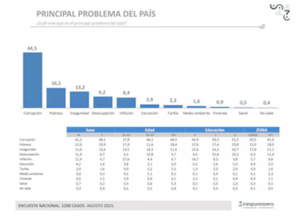 El relevamiento reflejó que el 44,5% de los consultados identificó la corrupción como el mayor problema que enfrenta el país, lo que significó una suba drástica en comparación con meses anteriores y acercó esta cifra al máximo histórico registrado en episodios resonantes del pasado.