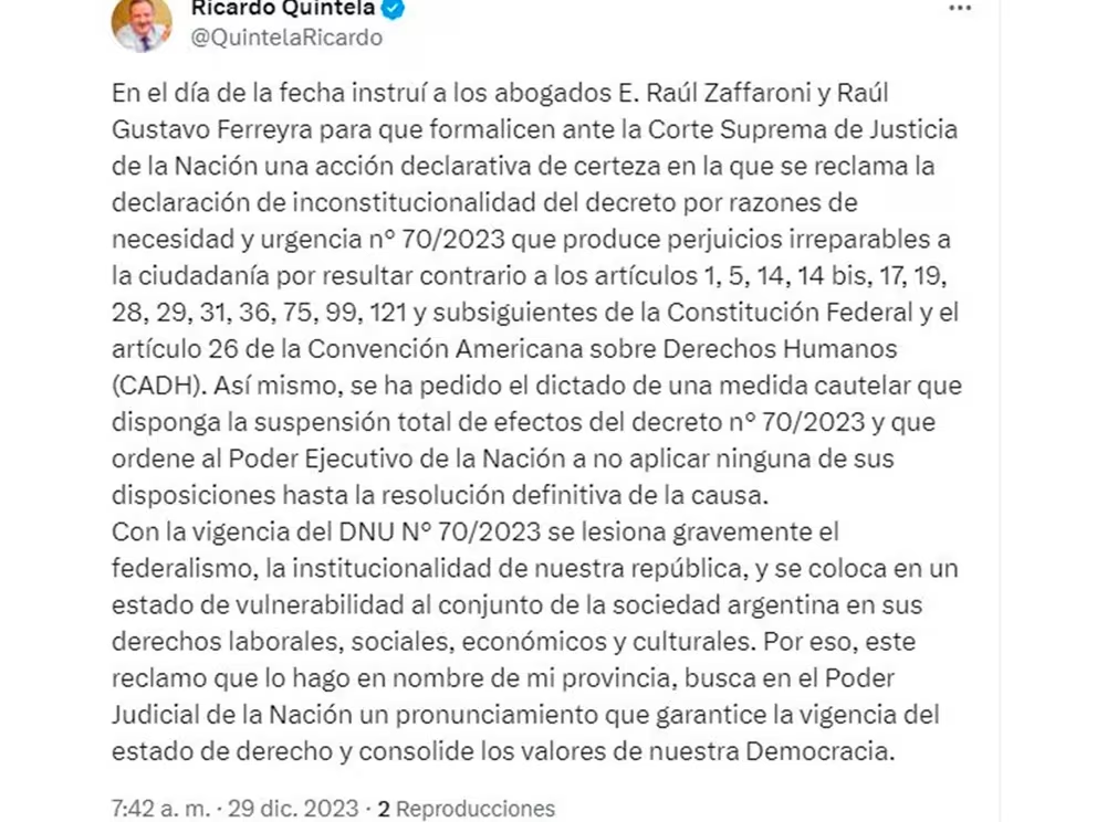 “Con la vigencia del DNU N° 70/2023 se lesiona gravemente el federalismo, la institucionalidad de nuestra república, y se coloca en un estado de vulnerabilidad al conjunto de la sociedad argentina en sus derechos laborales, sociales, económicos y culturales. Por eso, este reclamo que lo hago en nombre de mi provincia, busca en el Poder Judicial de la Nación un pronunciamiento que garantice la vigencia del estado de derecho y consolide los valores de nuestra Democracia”, escribió Quintela en una publicación de X (Twitter).