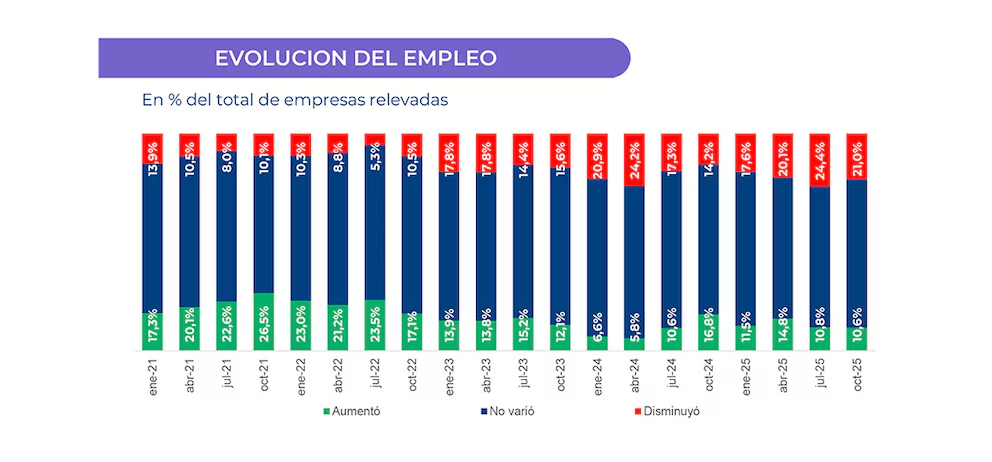 El empleo también registró retrocesos significativos. El 21,0% de las empresas redujo su dotación de personal, una cifra que permaneció entre las más elevadas de los relevamientos recientes. La proporción de empresas que adoptó reducción de turnos laborales ascendió al 23,5%, mientras el 7,7% aplicó suspensiones, decisiones que crecieron de manera sostenida a lo largo de los últimos cinco informes. Estos movimientos afectaron por igual a Micro, Pequeñas, Medianas y Grandes.