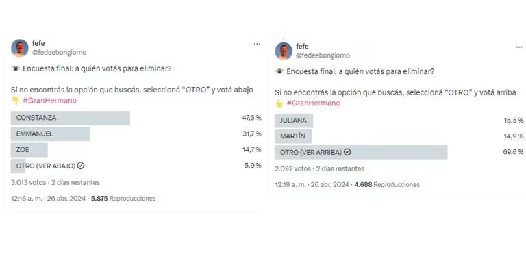 Por lo tanto, el especialista de Gran Hermano, Fefe Bongiorno, compartió una encuesta para que el supremo decida y anticipe quién será el próximo hermanito eliminado del reality. El influencer dividió en dos la placa e hizo dos tandas de jugadores, por lo que se conocieron los resultados de qué opina la gente: