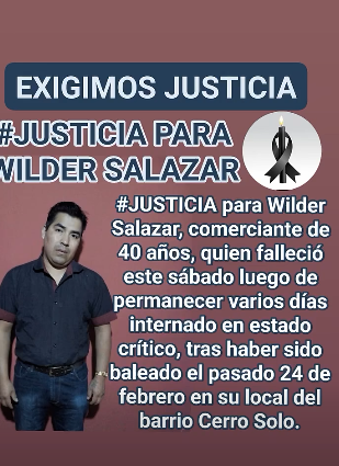 A través de redes sociales, la entidad publicó: “EXIGIMOS JUSTICIA para Wilder Salazar, comerciante de 40 años, quien falleció este sábado luego de permanecer varios días internado en estado crítico. El entierro se realizará este lunes a las 14:00 en el Cementerio de la ciudad (Zona Sur). Con profundo dolor, despedimos a Wilder. Nuestras condolencias a su familia”.