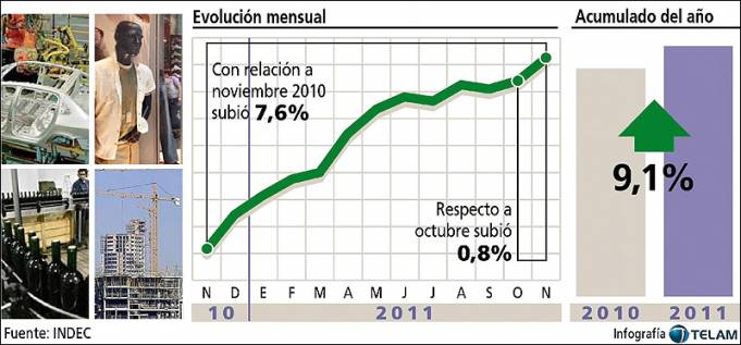 La actividad económica creció durante noviembre último un 7,6% en relación a igual mes del 2010, alentada por el consumo, informó hoy el Instituto Nacional de Estadística y Censos (INDEC). El organismo informó además que el Estimador Mensual de la Actividad Económica (EMAE) avanzó durante noviembre un 0,8% en comparación a octubre.