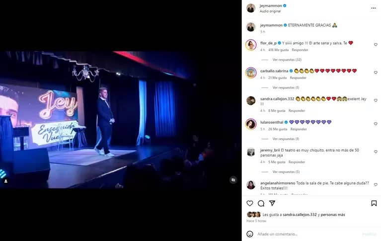 “Toda la sala de pie, ¿te cabe alguna duda? ¡Éxitos totales!”, “Me encanta que te vaya bien y el público te apoye después de tanto sufrimiento que tuviste que pasar”, “¡A brillar, Jey! Te mereces esos aplausos de pie…”, fueron algunos de los comentarios que más se repitieron.