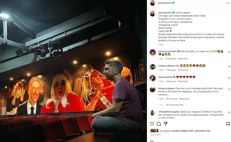 Días atrás, Jey se había mostrado muy entusiasmado por el debut. “Acá los espero. Con algo que vengo preparando hace meses. Dispuesto a reír y cantar juntos. A vernos a los ojos y abrazarnos. Enseguida vuelvo. Teatro Zorba, Carlos Paz”, escribió junto a una postal desde el escenario. Allí agradeció a Gustavo Sofovich, José Luis Letona, Eduardo Giordano y Rene Bertrand “por la apuesta y el amor”.