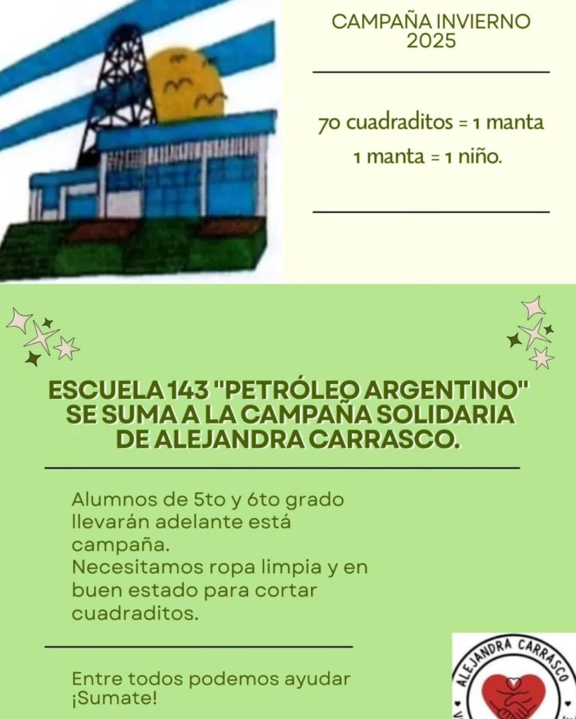Con el objetivo de brindar abrigo a quienes más lo necesitan durante el invierno, la Escuela N° 143 “Petróleo Argentino” se unió a la Campaña Solidaria de Alejandra Carrasco. Esta iniciativa busca confeccionar mantas a partir de cuadraditos de tela reciclada, y será impulsada por los alumnos de 5to y 6to grado de la institución.
