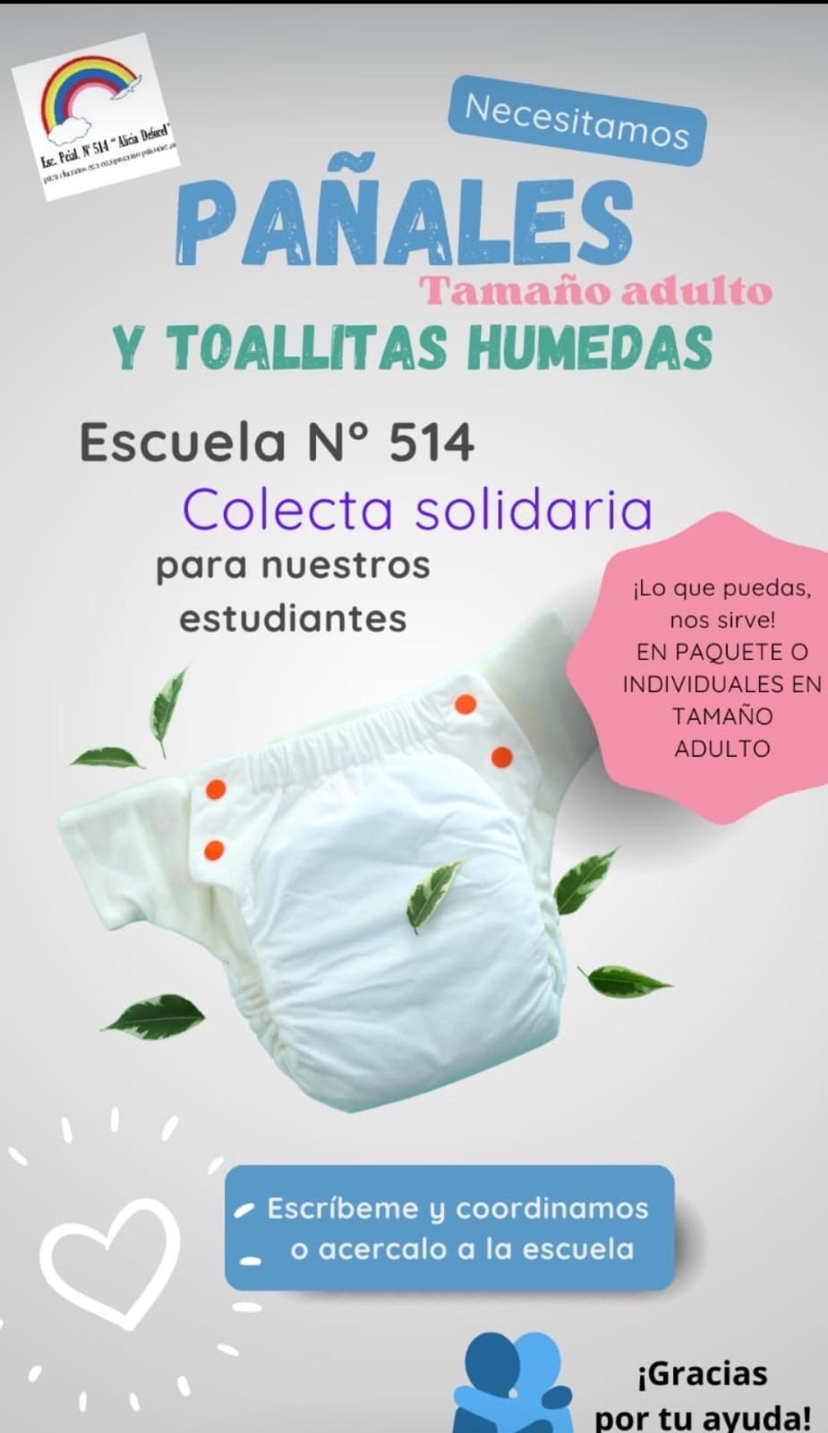 «Cualquier donación la haremos llegar a la persona que corresponde, igualmente desde la escuela siempre recibimos ayuda generalmente, pero ahora se está haciendo más complicado el tema del insumo de pañales y toallitas que son de bebés porque está la situación económica que nos complica a todos», indicó.