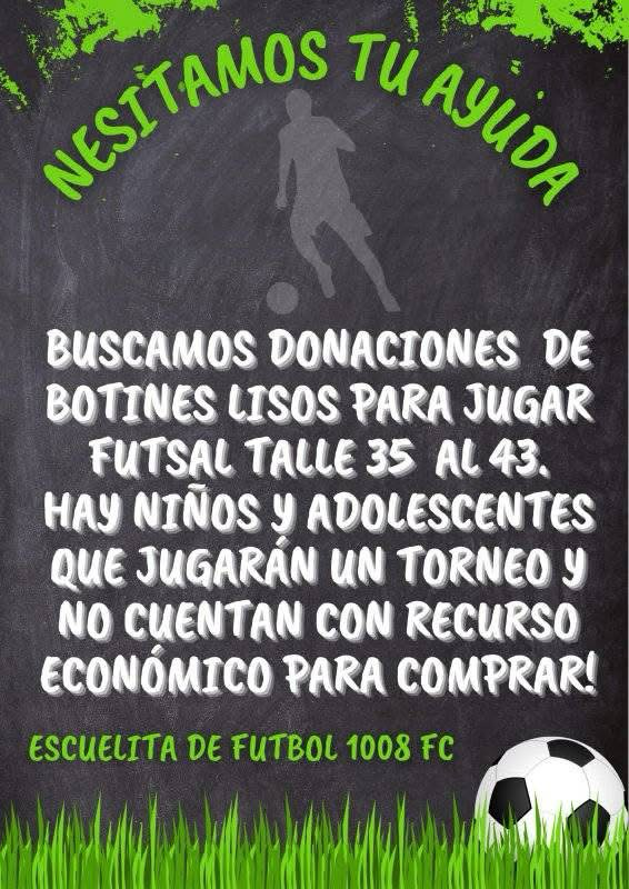 La escuelita de fútbol 1008 FC lanzó una campaña solidaria para recolectar donaciones de botines lisos de futsal, en talles del 35 al 43, destinados a niños y adolescentes que participarán en un torneo y no cuentan con los recursos económicos para comprarlos.