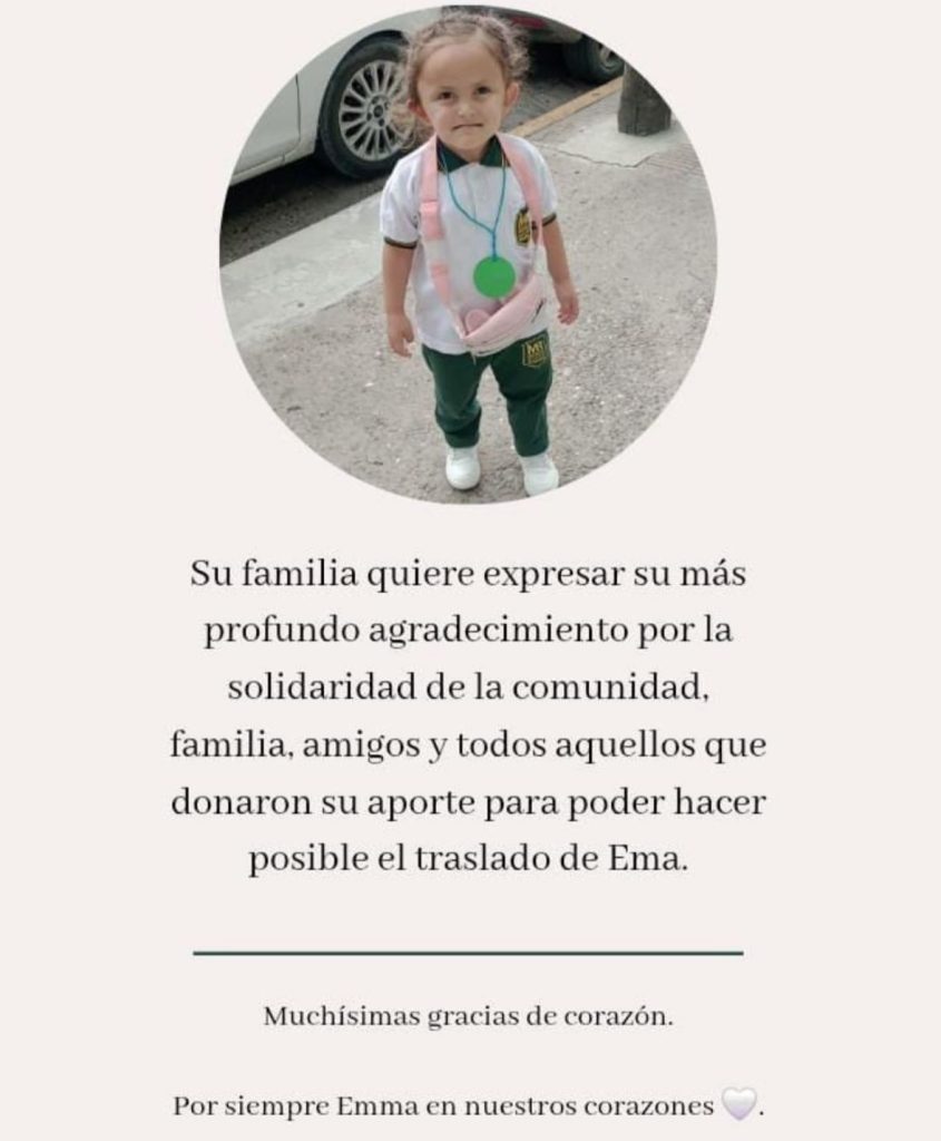 La familia de Emma agradeció el apoyo recibido de vecinos, familiares, amigos y todas las personas solidarias que colaboraron para hacer posible el traslado de la pequeña. A través de redes sociales, informaron que: «se logró reunir el dinero necesario para llevar a cabo este proceso tan importante para la familia».