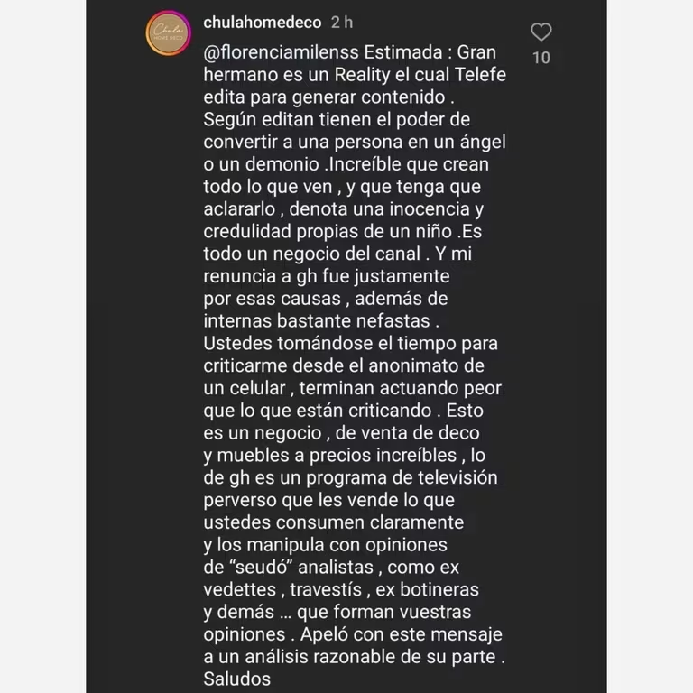 Si bien no había manifestado su malestar con el reality en sí y argumentó que su salida era estrictamente para encontrarse con sus seres queridos, en las últimas horas la comerciante utilizó su cuenta de Instagram para exponer su verdadera opinión al respecto, en respuesta a un usuario que la estaba criticando en las redes sociales de su emprendimiento. “Estimada: Gran Hermano es un reality el cual Telefe edita para generar contenido. Según editan tienen el poder de convertir a una persona en un ángel o un demonio. Increíble que crean todo lo que ven y que tenga que aclararlo, denota una inocencia y credulidad propias de un niño”, comenzó diciendo la exhermanita.
