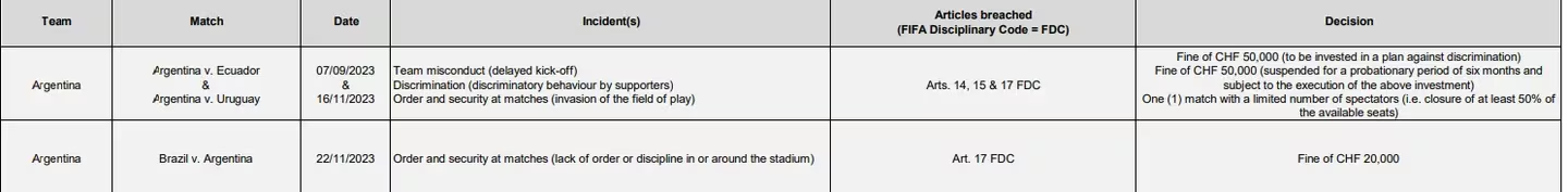 Las acciones que motivaron a esta sanción son “falta de conducta de equipo” por un retraso en el inicio del partido, “discriminación” por parte de los hinchas ante Ecuador y “falta de orden y seguridad” por la invasión del campo ante Uruguay. Los incidentes en Brasil fueron catalogados de la misma manera que el encuentro ante la Celeste y el equipo local deberá pagar una multa de 50 mil francos suizos.