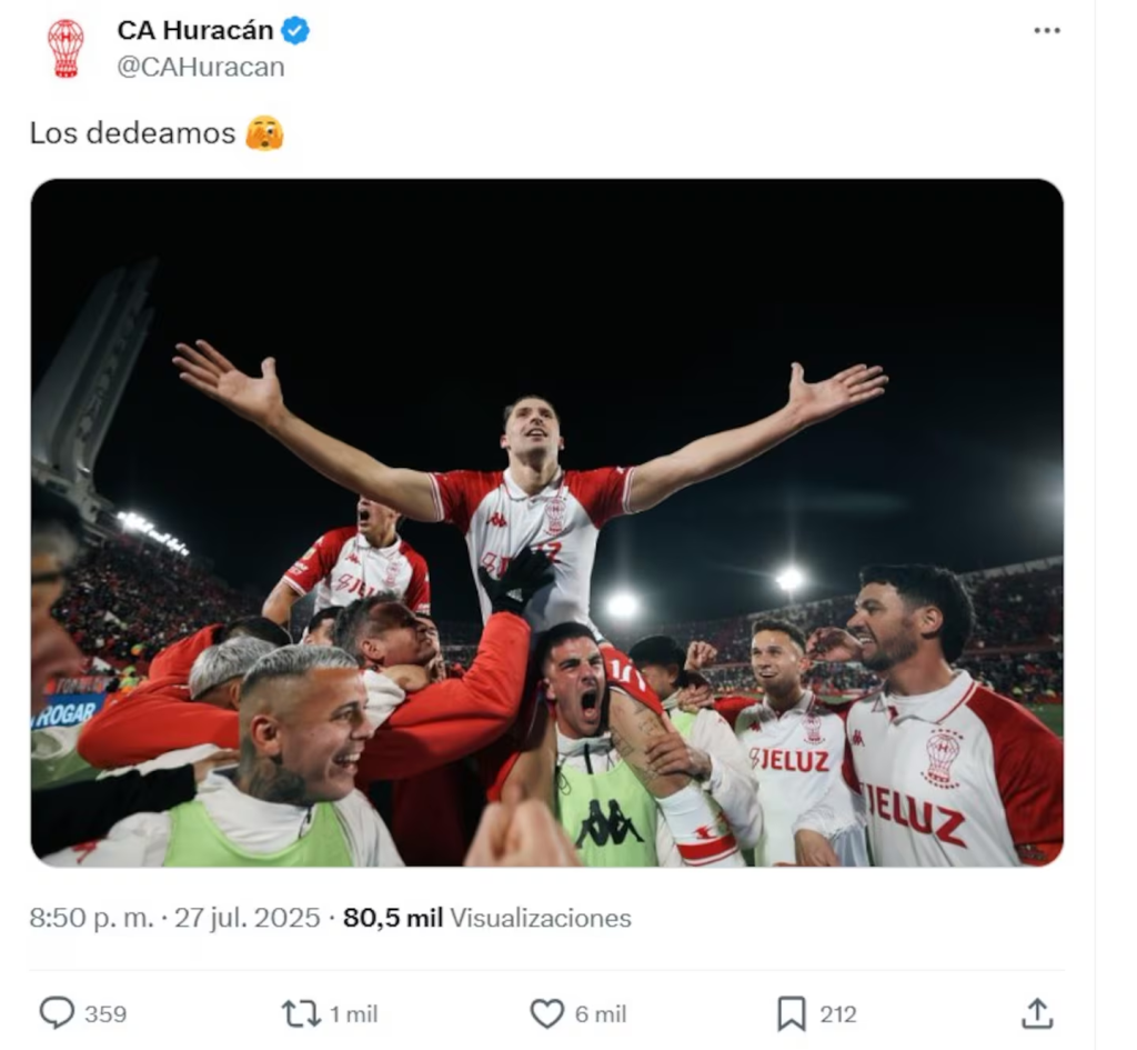 El posteo de Huracán duró apenas 20 minutos. Desde la delegación del conjunto de la Ribera consideraron que el mensaje cruzaba un límite y pidieron que lo borraran