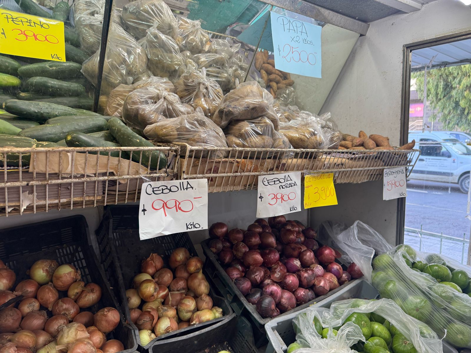 Las manzanas se ofrecen a $2.390 por kilo, mientras que los morrones verde y rojo tienen un precio de $2.900 por kilo. Las papas se venden a dos kilos por $2.500.