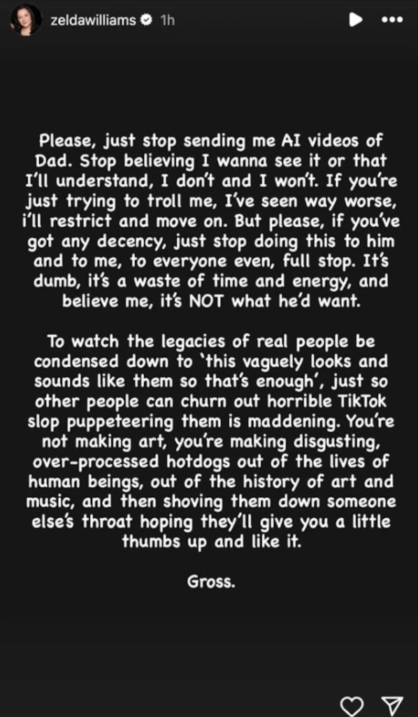 “Por favor, dejen de enviarme videos de papá hechos con IA. Dejen de creer que quiero verlos o que lo entenderé, no los quiero ni los entenderé”, lanzó en el largo texto que escribió.