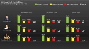 Tanto el kirchnerismo como la UCR, el peronismo disidente y el socialismo vieron afectadas las mediciones de sus principales referentes en el comienzo del 2014. Los más golpeados fueron el Gobierno en general y la presidente Cristina Fernández en particular. De diciembre a enero, la imagen positiva de la mandataria pasó de 45,3% a 34,8 por ciento, mientras que la de su administración cayó de 43,2% a 33,1 por ciento. En ambos casos se produjo un fuerte incremento de las opiniones negativas, que saltaron más de doce puntos porcentuales y se ubicaron por encima del 35 por ciento.